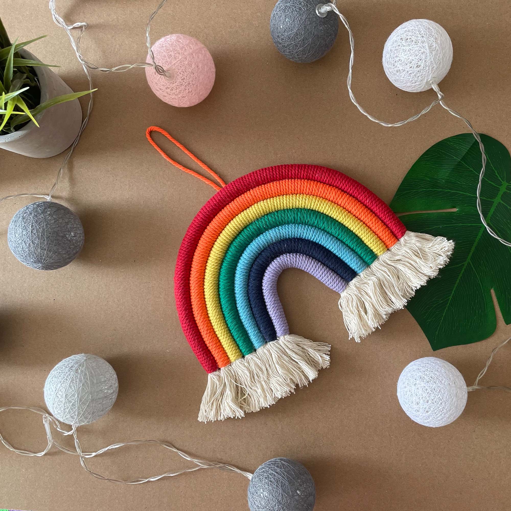 Beautiful seven-row handwoven macrame rope and cotton yarn rainbow.