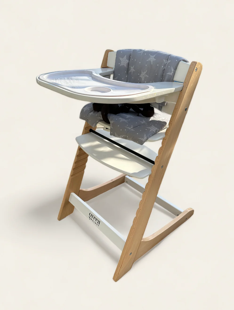 - Greenwalnut's wooden high chairs are designed to be adjustable to grow with the child. This includes adjustable seat heights and adjustable foot rest for added comfort during different stages of a child's development.